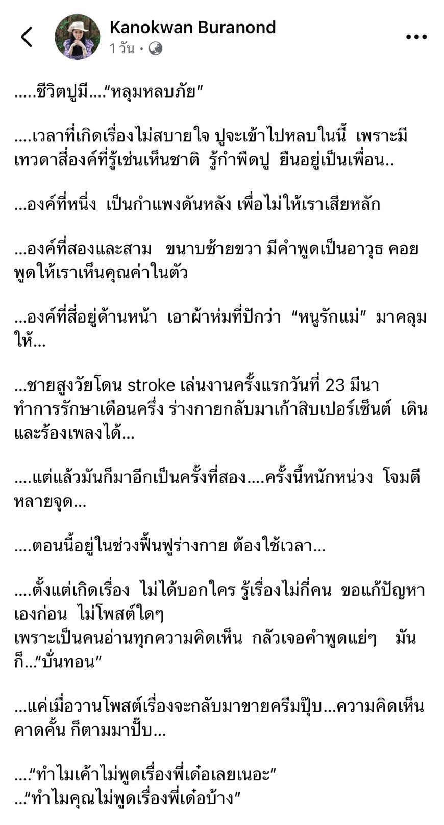 ล่าสุด ปู กนกวรรณ ภรรยาของ เด๋อ ดอกสะเดา ก็ได้ออกมาโพสต์ข้อความผ่านเฟซบุ๊กส่วนตัว เขียนถึงช่วงเวลาที่ยากลำบากที่สุดของชีวิต ก็จะมีหลุมหลบภัยเป็นที่ให้เข้าไปหลบเวลามีเรื่องไม่สบายใจ พร้อมกับเผยเหตุผลที่ไม่บอกใครว่า สามีป่วย ก็เพราะว่า กลัวเจอคำพูดแย่ๆ จากคนมาบั่นทอนใจ