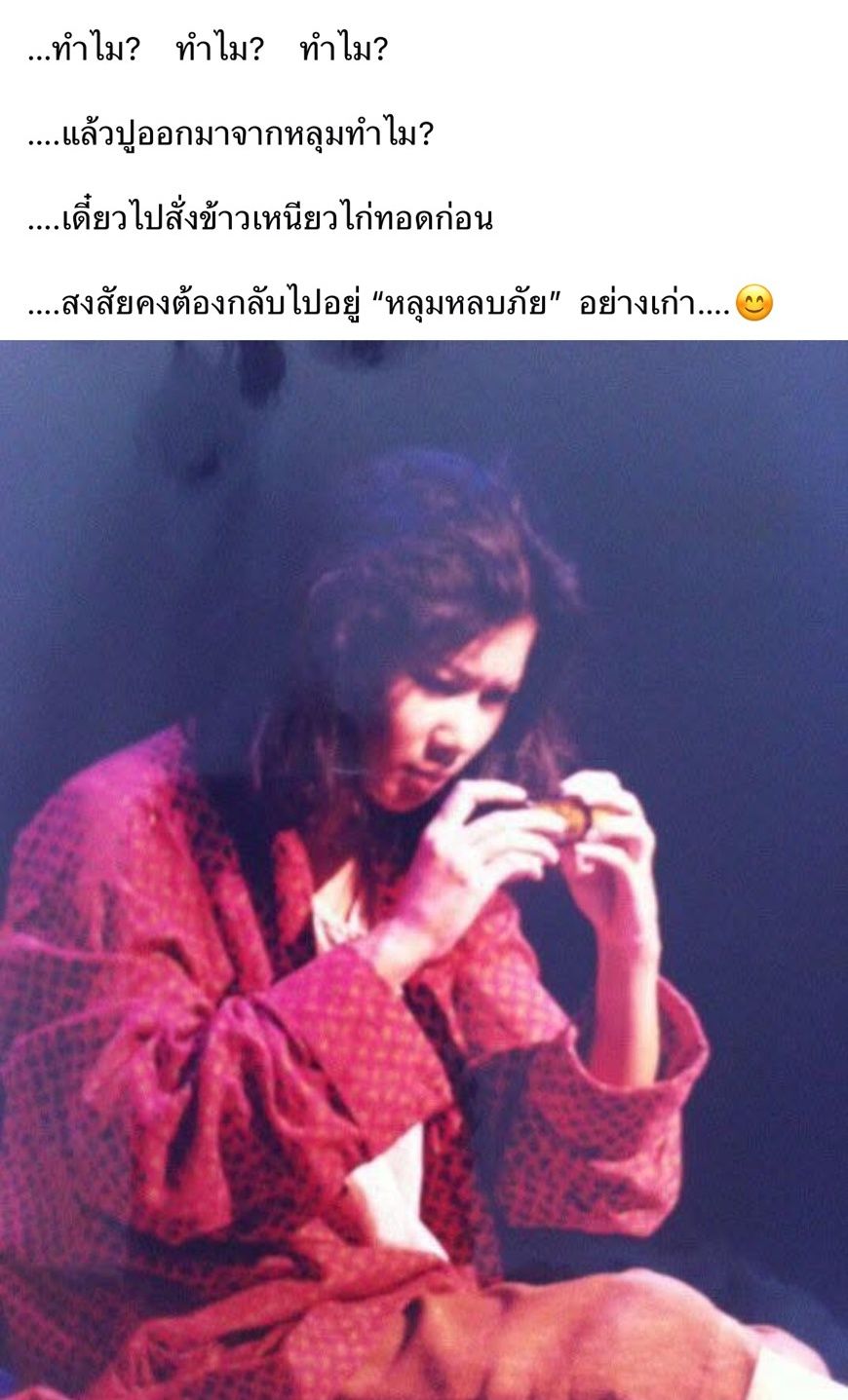 “ทำไมเค้าไม่พูดเรื่องพี่เด๋อเลยเนอะ” “ทำไมคุณไม่พูดเรื่องพี่เด๋อบ้าง” ทำไม? ทำไม? ทำไม? แล้วปูออกมาจากหลุมทำไม? เดี๋ยวไปสั่งข้าวเหนียวไก่ทอดก่อน สงสัยคงต้องกลับไปอยู่ “หลุมหลบภัย” อย่างเก่า”