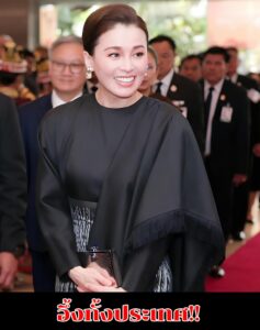ทรงฉลองพระองค์ตัดเย็บจากผ้าไหมมัดหมี่ลายก้างปลา ผสมผสานกับผ้าไหมลายลูกแก้ว ออกแบบโดยห้องเสื้อ MESHMUSEUM ตัดเย็บจากผ้าไหมมัดหมี่สีดำสลับเทาผ้าซิ่นถูกทำลายขึ้นมาแบบลายก้างปลา ผสมผสานกับ ผ้าไหมทอลายลูกแก้ว ทรงฉลองพระองค์ชุดนี้โดดเด่นด้วยงานออกแบบที่แสดงเอกลักษณ์ไทยได้อย่างงดงามเลยจริงๆ เป็นการสืบสาน ผ้ามัดหมี่ ที่พระพันปีทรงอนุรักษ์ไว้ สืบสานและฟื้นฟูงานผ้าทอและหัตถศิลป์ของไทย