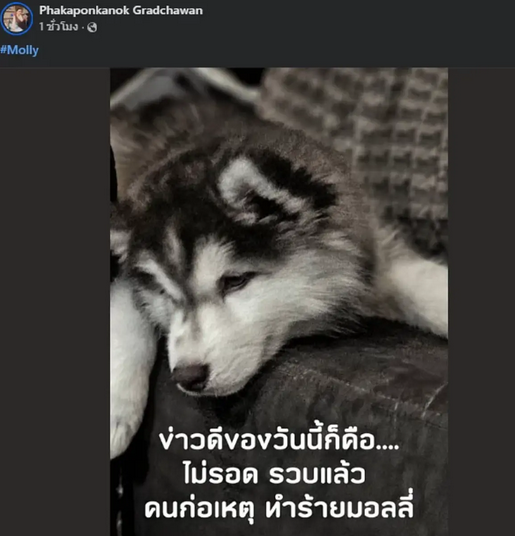 จากกรณี สุนัขสายพันธุ์ไซบีเรียน ชื่อ มอลลี่ เพศเมีย อายุ 2 ปี ถูกคนร้ายไม่ทราบเพศและอายุทารุณกรรมโดยการเอาน้ำมันเบนซินมาราดบนตัวสุนัขกลางถนน ก่อนจุดไฟทำให้ไฟไหม้ได้ลุกไหม้ท่วมไปทั้งตัว ก่อน