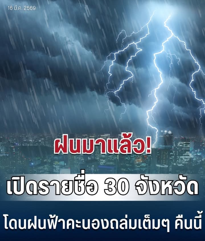 วันที่ 16 มีนาคม 2569 กรมอุตุนิยมวิทยาออกประกาศพยากรณ์อากาศ 24 ชั่วโมงข้างหน้า ระบุว่า ประเทศไทยตอนบนมีอากาศร้อนในตอนกลางวัน แต่ยังคงมีฝนฟ้าคะนองบางแห่ง บริเวณภาคเหนือ ภาคกลางตอนล่าง และภาคตะวันออก เนื่องจากบริเวณความกดอากาศสูงหรือมวลอากาศเย็นกำลังอ่อนจากประเทศจีนยังคงปกคลุมภาคตะวันออกเฉียงเหนือ และทะเลจีนใต้ ส่งผลให้ลมตะวันออกและลมตะวันออกเฉียงใต้ที่พัดปกคลุมประเทศไทยตอนบนมีกำลังอ่อน