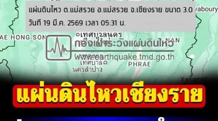 เมื่อเวลา 05.31 น. วันที่ 19 มีนาคม 2569 กองเฝ้าระวังแผ่นดินไหว กรมอุตุนิยมวิทยา รายงานเกิดแผ่นดินไหวขนาด 3.0 โดยมีจุดศูนย์กลางอยู่ที่ตำบลแม่สรวย อำเภอแม่สรวย จังหวัดเชียงราย ที่ความลึกเพียง 2 กิโลเมตร ซึ่งจัดเป็นแผ่นดินไหวระดับตื้น ส่งผลให้ประชาชนในหลายพื้นที่สามารถรับรู้แรงสั่นสะเทือนได้อย่างชัดเจน